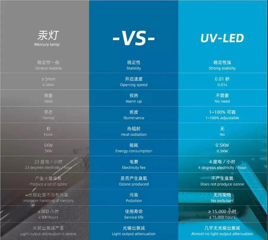 LED固化是將電能轉換成UV光,光線能量高度集中在特定紫外光波段,而且LED光固化只在照射時才消耗電力,待機消耗近乎零,整體能耗較傳統(tǒng)汞燈、鎵燈降低70%以上。通常情況下,一支傳統(tǒng)UV燈管的功率約為12KW,而一支LED燈管的功率僅為4.5KW,省電優(yōu)勢明顯。