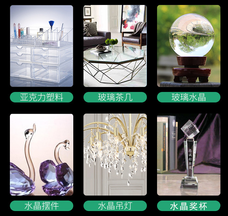 主要用于至少一面是透明材質(zhì)的粘接工作中,如:塑料與塑料、塑料與玻璃、塑料與金屬等材料的粘接。主要針對工藝品行業(yè)塑料的自粘和互粘,家具行業(yè),例如:茶幾玻璃與鋼架粘接,玻璃魚缸粘接,包括PMMA亞克力(有機(jī)玻璃)、PC、ABS、PVC、PS等熱塑性塑料。